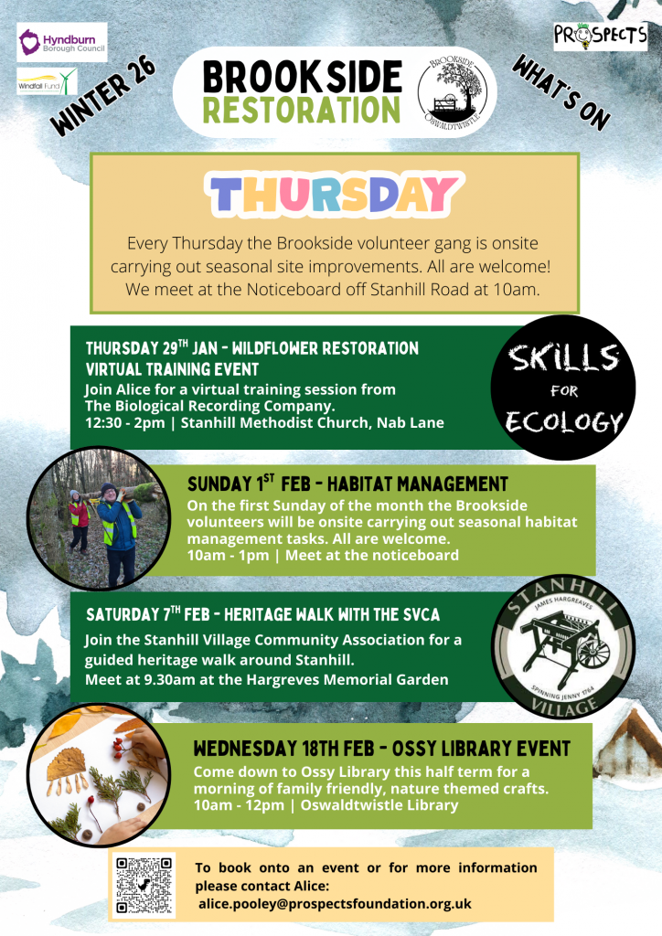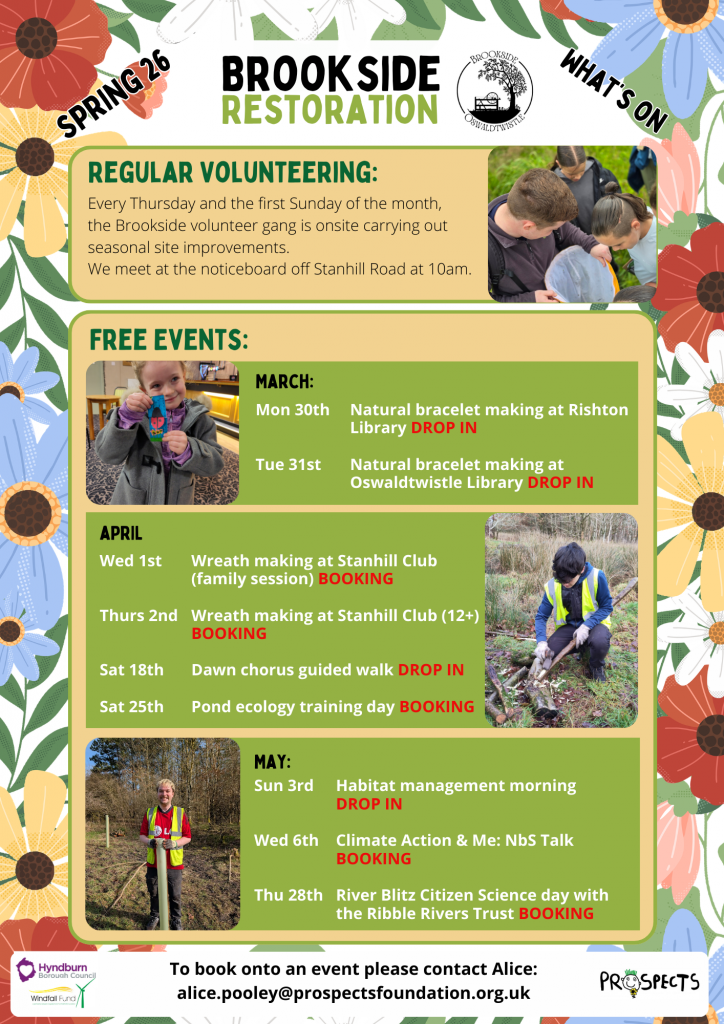 If you have any questions about the Brookside Restoration Initiative, please reach out to our project officer, Alice. You can reach her by email at alice.pooley@propsectsfoundation.org.uk or by phoning the PROSPECTS Foundation office on 01254 230348