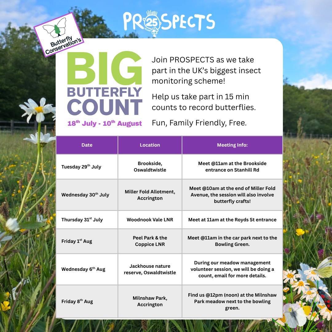 Join PROSPECTS as we take part in the UK’s biggest insect monitoring scheme. This session will take place at Woodnook Vale LNR, meeting at Royds St entrance, moving on to King George’s meadow (next to the playing field,) and finally Jubilee Woods meadow.