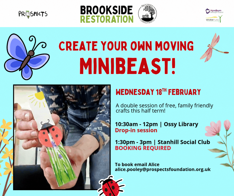 Come on down to the Stanhill Social Club this February half term for a free crafting event! Create and decorate a beautiful moving minibeast to take home, and learn more about our work to help nature across Hyndburn.