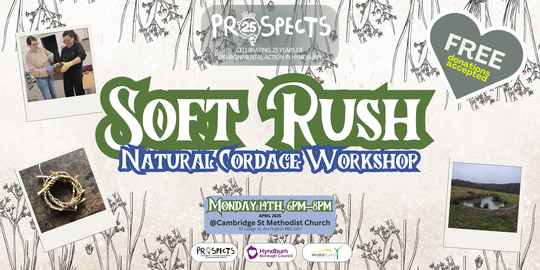 Using locally foraged Soft Rush, learn a simple natural cordage making skill. The cordage can be used to make bracelets, baskets, bags and more! Join PROSPECTS for a free crafting event, whilst learning a bit about your local green spaces. Family friendly & perfect for beginners.