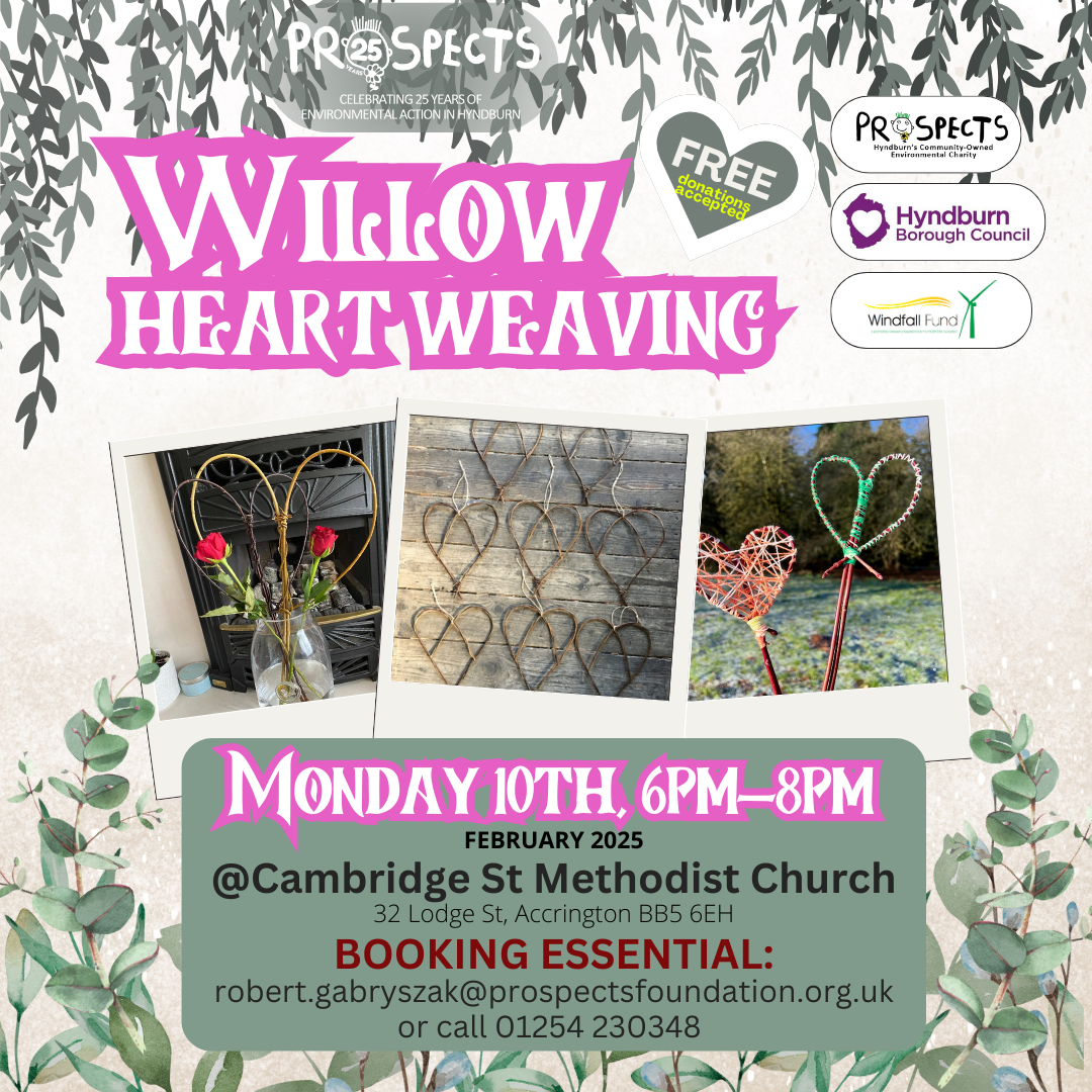 Using locally foraged willow, learn how to make willow hearts for use as decorations or gifts for Valentine’s day! Join PROSPECTS for a free crafting event, whilst learning a bit about your local green spaces. Family friendly & perfect for beginners.
