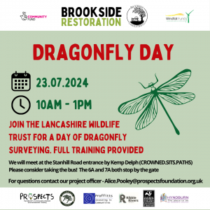Join our Brookside Restoration Coordinator Alice for a Dragonfly ID session hosted by the Lancashire Wildlife Trust. The meeting point is the Kemp Delph entrance to Brookside, on Stanhill Road. Staff will be in orange hi-vis. Limited parking is available but please consider taking public transport - the 6A and 7A bus stop right by […]