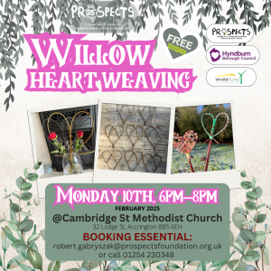 Using locally foraged willow, learn how to make willow hearts for use as decorations or gifts for Valentine’s day! Join PROSPECTS for a free crafting event, whilst learning a bit about your local green spaces. Family friendly & perfect for beginners. Join us on Monday 10th February @6pm - 8pm at Cambridge St Methodist Church, […]