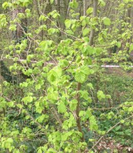 Hazel is a very useful tree found in woodlands and hedges. It can grow up to 12m in height but traditionally it was coppiced (cut down when 10 to 12 years old) and left to regrow. The coppiced wood has a variety of traditional uses as it can be twisted or knotted, including hurdles, thatching spars, furniture and water-divining sticks. It can also be used to make charcoal and is also valued for it’s nuts or cobs. Hazel grows both male and female flowers and in Spring the male flowers appear as yellow catkins before the leaves and the female flowers are small and bud like. The leaves are bright green when they appear and grow to become large and oval and have a hairy underside which makes them soft to touch. The leaves provide food for a variety of moth caterpillars and coppiced Hazel trees provide shelter for ground nesting birds. The nuts provide food for a range of birds and animals and are particularly associated with Dormice. Hazel was known as a magical tree and a Hazel rod was meant to protect against evil spirits as well as being used as a wand and for water-divining. In some parts of England hazelnuts were used as charms or held to ward off rheumatism. In Ireland it was known as the tree of knowledge and in medieval times was a symbol of fertility.